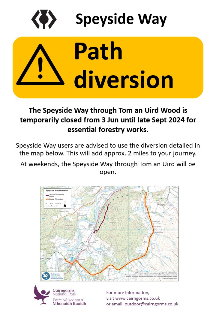 Temporary diversion at Tom an Uird woods, Cromdale, from 3rd June to late September 2024